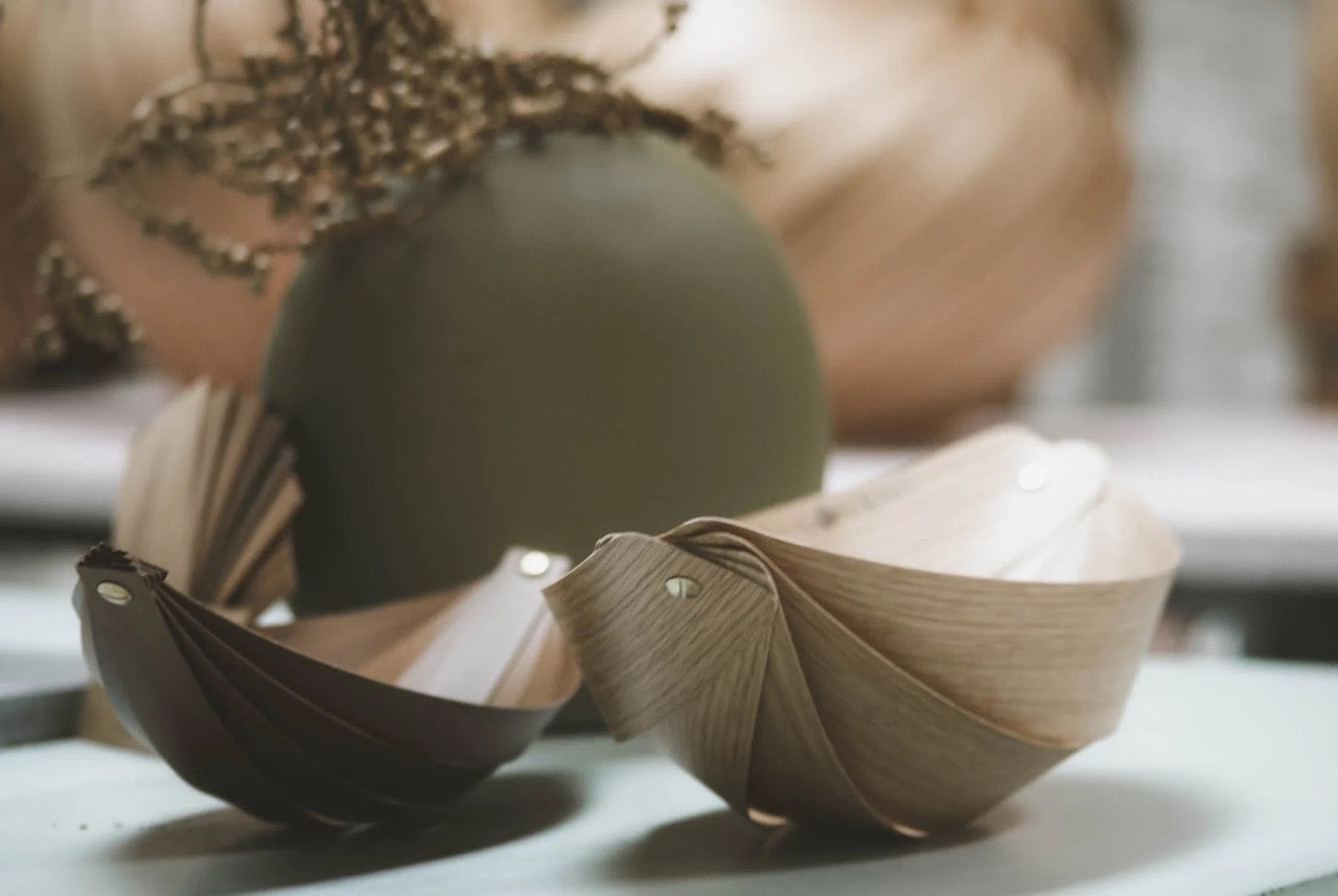 ZERO WASTE – darauf arbeiten wir tagtäglich hin! Die Verschnitte des Holzfurniers, aus welchem wir unsere Leuchten herstellen, werden in unserem Atelier nicht entsorgt. Stattdessen stellen wir daraus Lesezeichen und Obstschalen her, die wir für einen kleinen Preis verkaufen.